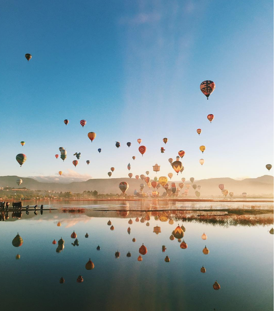 Imagine looking up into the pink and orange sky and seeing hundreds of brightly colored hot air balloons, floating up like the clouds.